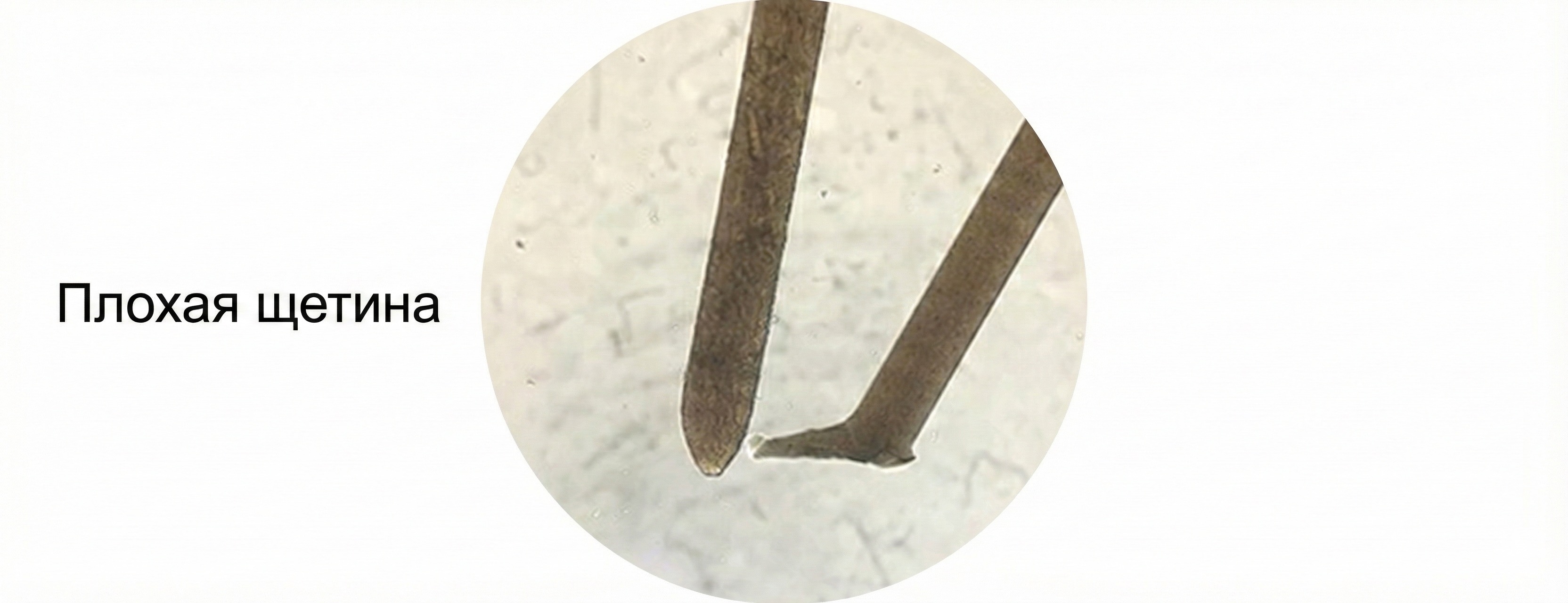 ① Закругление щетины: Острая щетина царапает эмаль. Мы посмотрели под микроскопом: