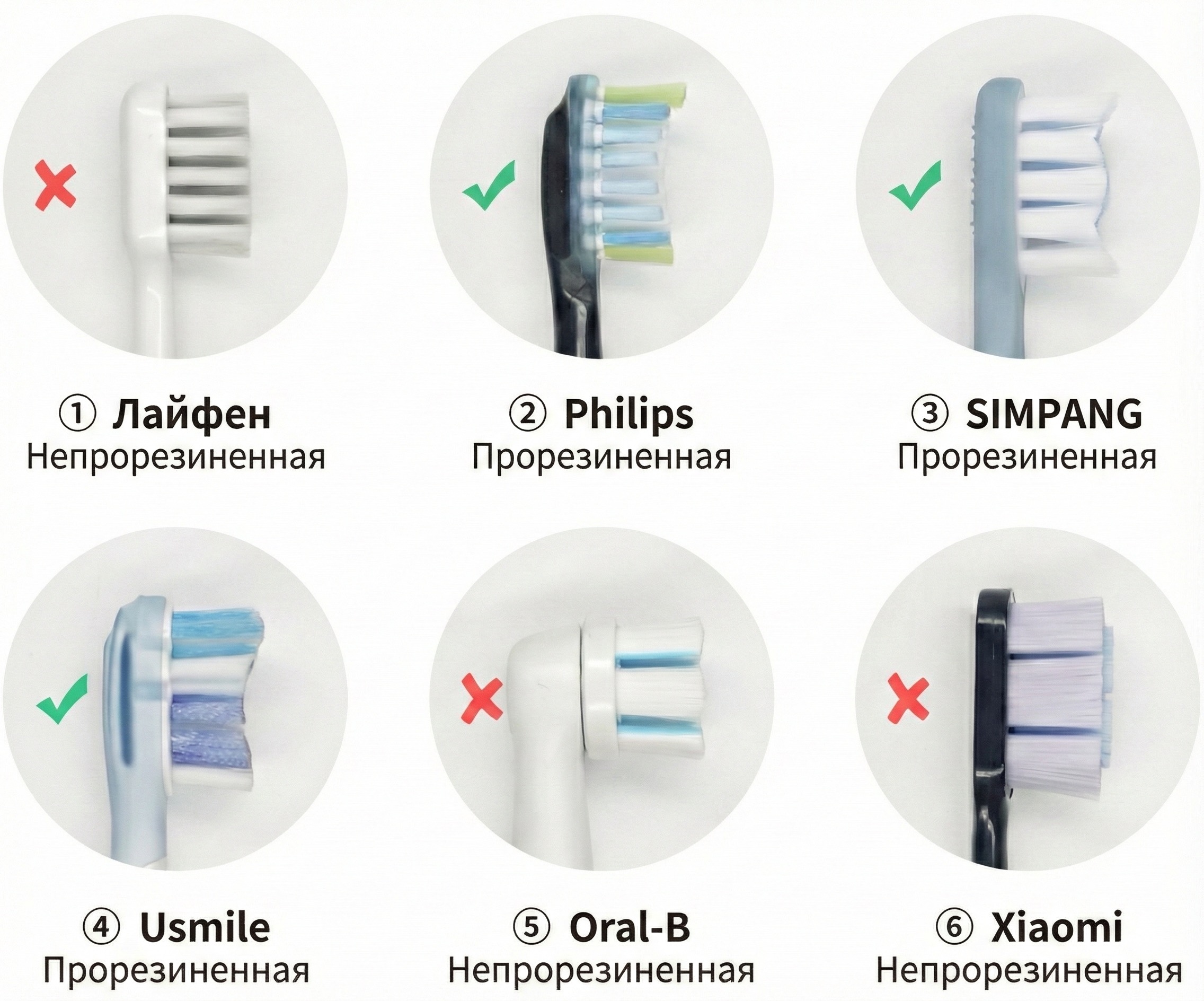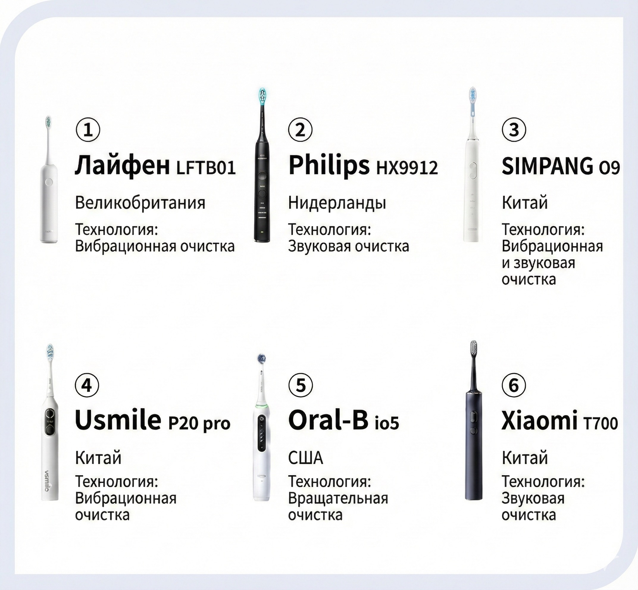 Мы протестировали 6 моделей: Philips, Oral-B, SIMPANG, Usmile, Лайфен, Xiaomi.